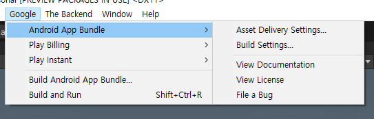 6. 그런다음 Google->Build Android App Bundle을 통해 빌드해주면 됩니다.